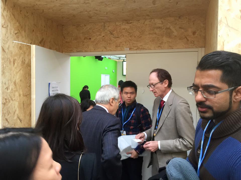 I did talk with Kevin Anderson from the Tyndall Center and met his colleague Alice Bows-Larkin from the Tyndall on the bus to the COP21 convention center. Will attend a seminar shortly with Anderson and Schellenhuber (sp?) who is a well known European climate scientist. Will be a busy day for sure. I will be speaking on abrupt climate disruption at a press conference in the early evening…