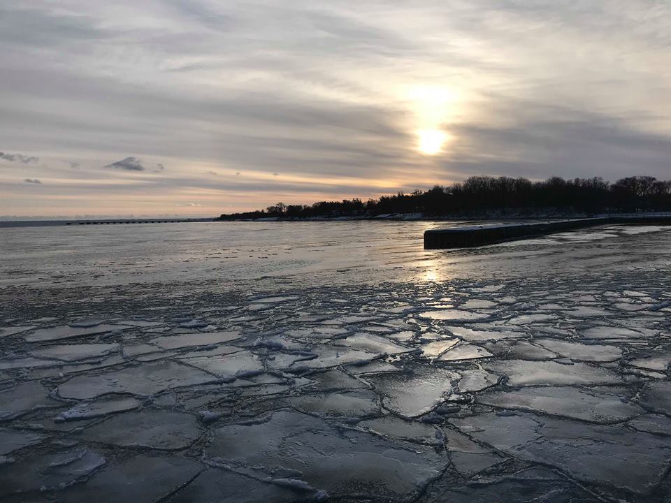 My birthday walk on Bronte Pier; pancake ice and sunset.