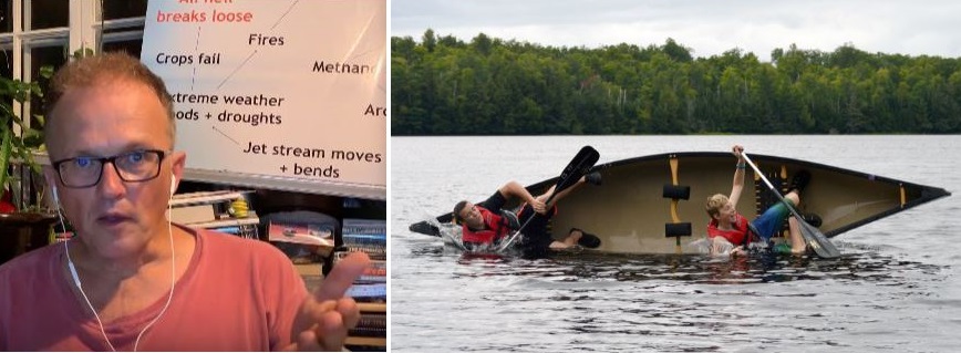 Some of the rapidly rising carbon dioxide in our atmosphere reacts with water forming carbonic acid, dissociating to bicarbonate ions, then carbonate ions, making the oceans much more acidic. Like a canoe reaching the tipping point, the ocean carbon cycle can cross a threshold and tip as we drive emissions ever higher.