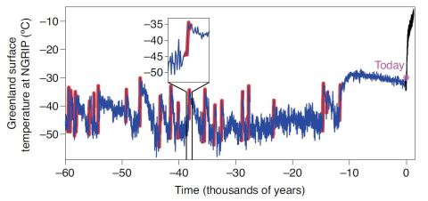During the last glacial period from 120,000 to 11,000 years ago, there were over 20 abrupt periods of rapid warming (D-O Oscillations) exceeding 1 degree C per decade warming recorded in the North Greenland Ice Project (NGRIP) cores.