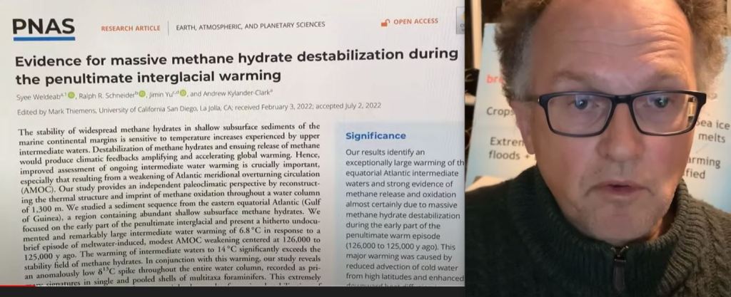 Ref 1: Evidence for massive methane hydrate destabilization during the penultimate interglacial warming. Link, here. Schneider, Yu, Kylander-Clark. Edited by Mark Thiemens, University of California San Diego, La Jolla, CA; received February 3, 2022; accepted July 2, 2022. August 22, 2022