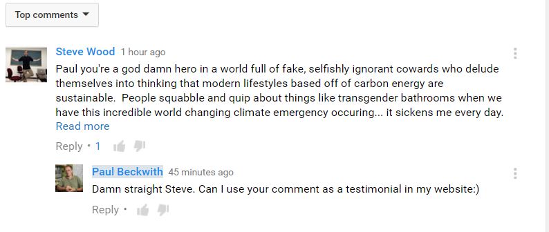 ‘Paul you’re a god damn hero in a world full of fake, selfishly ignorant cowards who delude themselves into thinking that modern lifestyles based off of carbon energy are sustainable. People squabble and quip about things like transgender bathrooms when we have this incredible world changing climate emergency occurring… it sickens me every day. I’ll be donating on your website on a monthly basis‘.